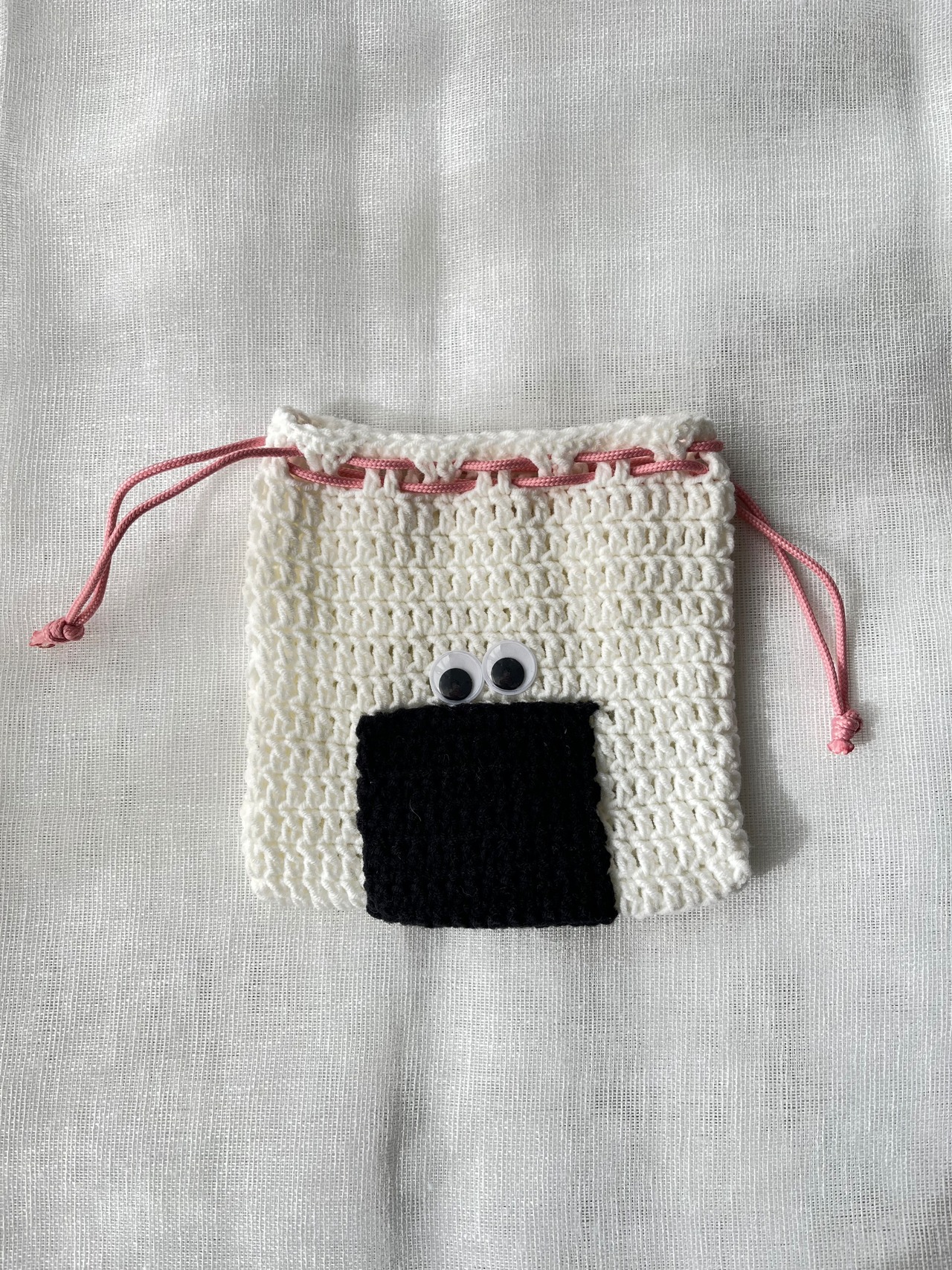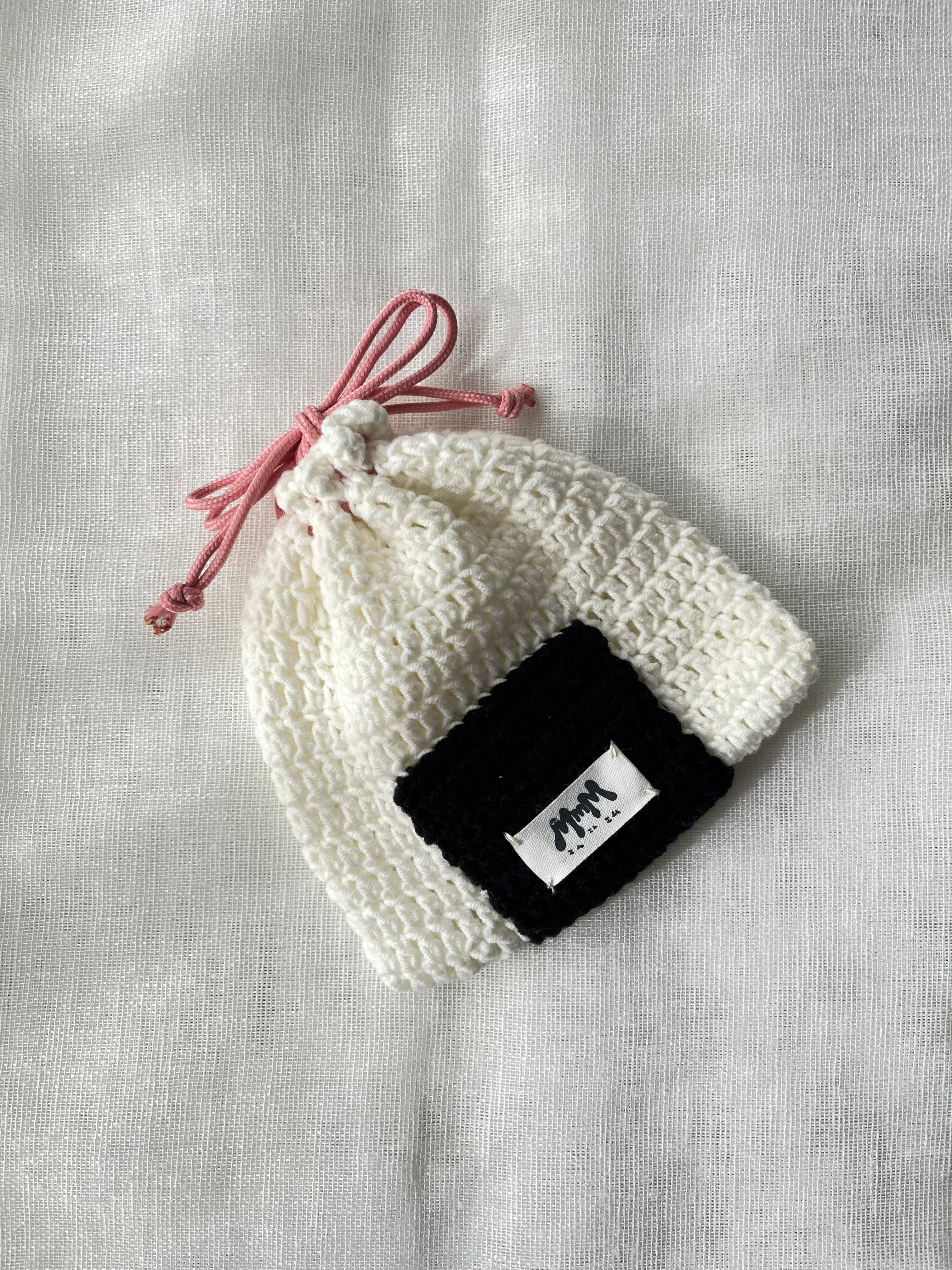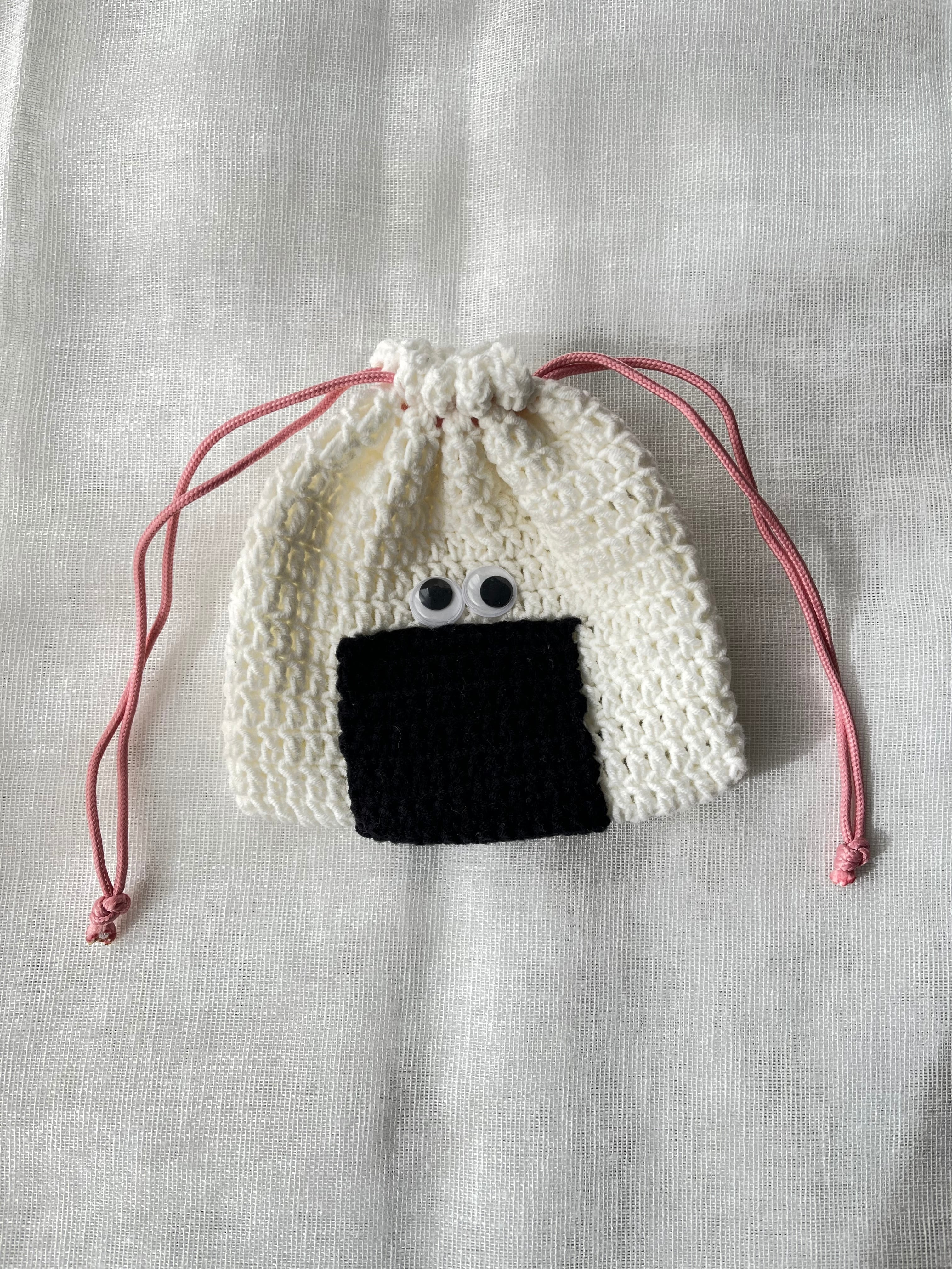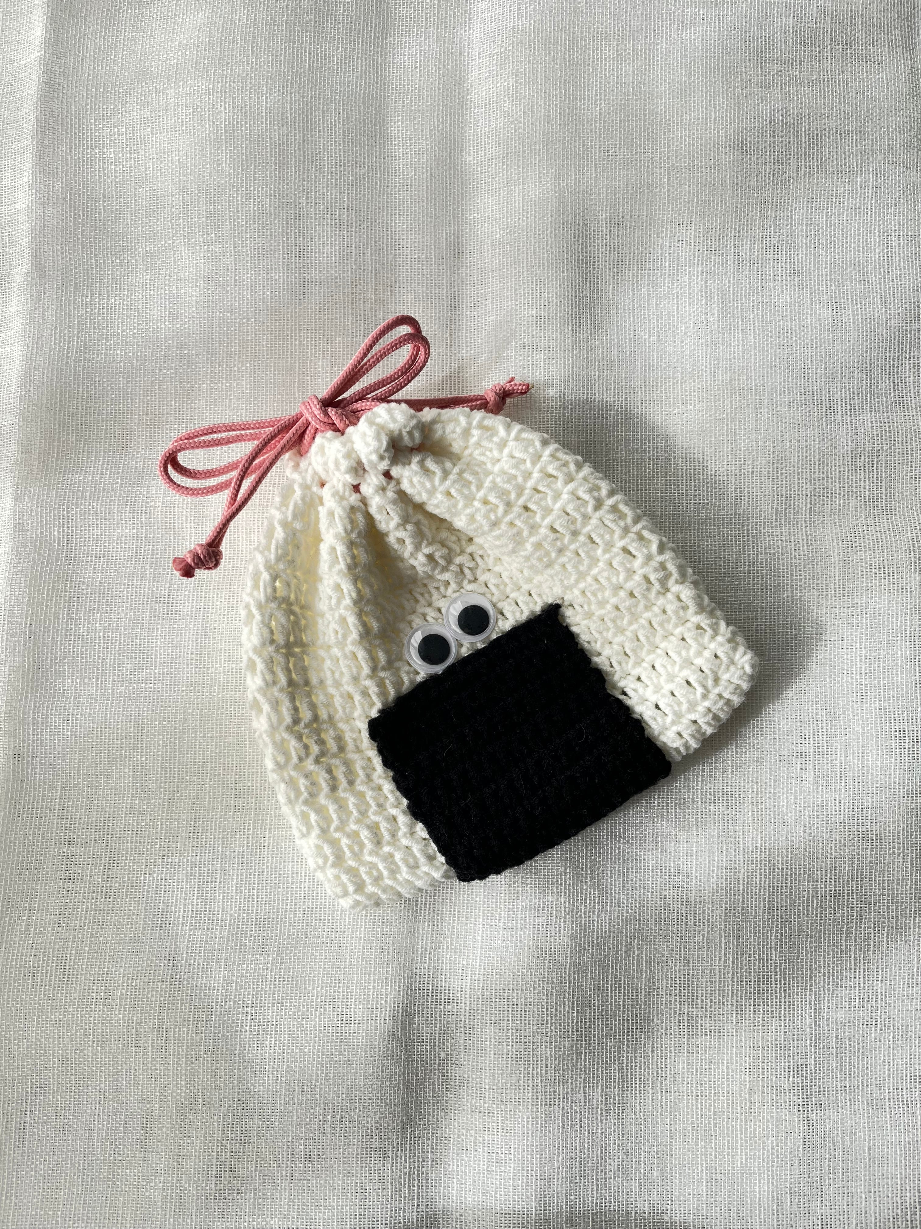 明太子に見立てたピンクの紐がアクセントになるおにぎり巾着ポーチ